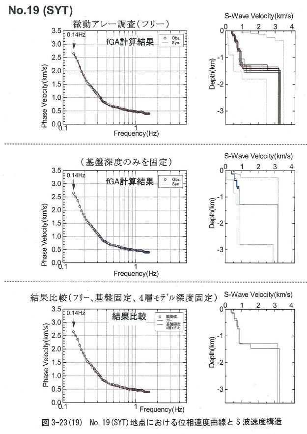 図3−23−1,図3−23−2,図3−23−3,図3−23−4,図3−23−5,図3−23−6,図3−23−7,図3−23−8,図3−23−9,図3−23−10,図3−23−11,図3−23−12,図3−23−13,図3−23−14,図3−23−15,図3−23−16,図3−23−17,図3−23−18,図3−23−19,図3−23−20,図3−23−21,図3−23−22,図3−23−23,図3−23−24,図3−23−25,図3−23−26に全26地点の位相速度曲線とS波速度構造を、