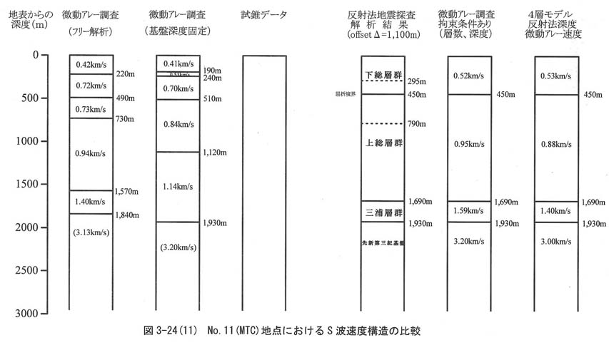 ・この方法によって求めた最適解を図2−59に並べて示してあるが基盤のS波速度に関しては十分に決め切れていない。それは、このパラメータの感度が小さいためと考えられる。そのために基盤のS波速度には、ばらつきが見られる。探査結果を使う側の立場に立てば基盤のS波速度が、ほぼ均一であることが予想されるときには、そのような解析結果を提示した方が便のよい場合も考えられる。そこで、参考資料として方法Aの類似であるが基盤S波構造を、ほぼ固定(3.0〜3.1km/s)した解析を行ってみた。各観測点における結果図は別冊資料集に付した。また、この結果を図2−59で行った表示方法を踏襲して表示したものを図3−27に示す。全体的にはS波速度のばらつきが小さくなった結果が得られたが、No.10(YAG)やNo.11(MTG)等では基盤深度がフリー解析比べて浅く解析された候補解しか得られなかったので反射法結果との整合性が悪い結果が得られた。これも@、Bのケースと同様に、拘束条件を加えた事による歪みと考えられる。