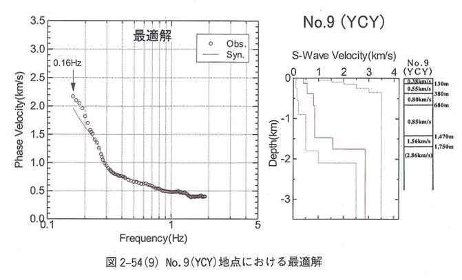 図3−23−9 No.9(YCY)地点における位相速度曲線とS波速度構造