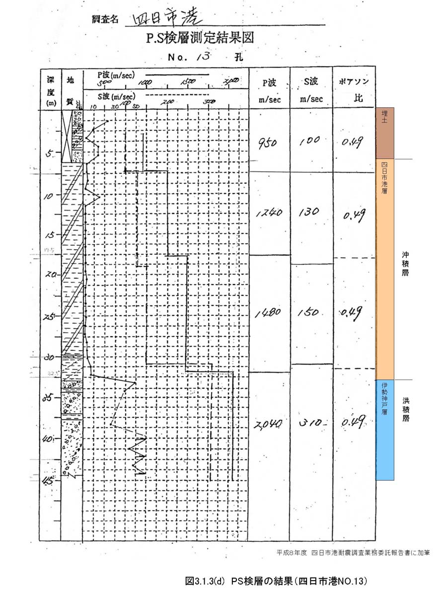 B 換算N値が50を超える部分を検索し、それをN値が50を越える上面深度とする。ただし、地表に岩盤が露出している部分については0mとした。この結果を図3−2−30−1および図3−2−30−2に示した。図3−2−30−3には伊勢湾内の反射法データによる解釈結果を併せて表示した。伊勢湾内の解釈は洪積層中の第一礫層上面の深度に相当する。