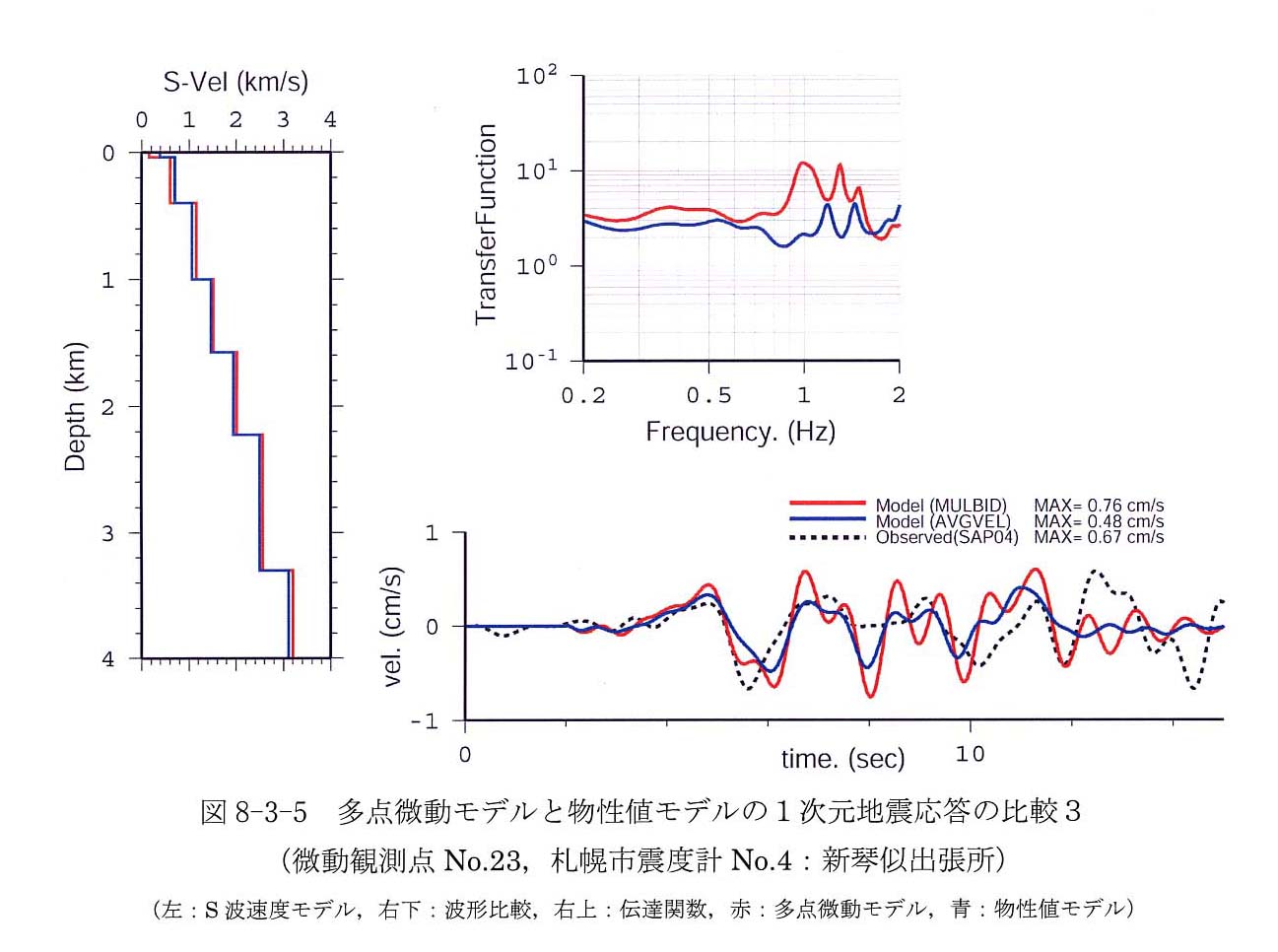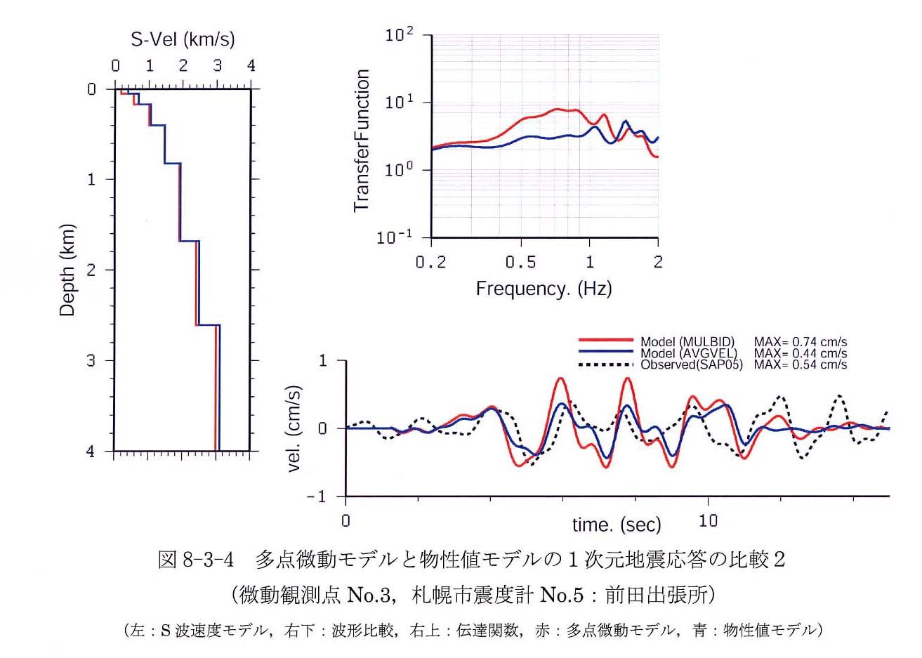 それに対して,微動観測点No.3(図8−3−4)では,多点微動モデルの1層目のS波速度は177m/sであるが,物性値モデルのS波速度は380m/sとその倍以上速く,その層厚は51mである。主にこの速度差によって,伝達関数(Transfer Function)の0.4〜0.9Hzの周波数帯域の増幅率は,物性値モデルの方が多点微動モデルより小さくなっている。また,応答波形の初動から2,3波目の振幅も,物性値モデルの方が多点微動モデルより小さい。しかし,実際観測された札幌市震度計No.5の波形と比較すると,多点微動モデルより物性値モデルの応答波形の方が整合性はよい。