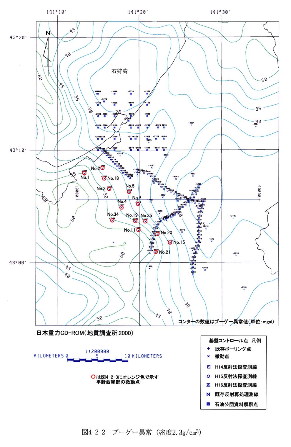 この図では,オレンジ色で示した微動観測点(No.1〜No.5,No.7,No.11,No.15,No.18〜No.21,No.34,No.35の14点)のデータが,その他のコントロール点の分布域からはずれている。これを図4−2−2のブーゲー重力異常でみると,いずれも平野西縁部または西縁部近くに位置する微動観測点であり,平野中央部のコントロール点とは,平面的にほぼ区別できる。