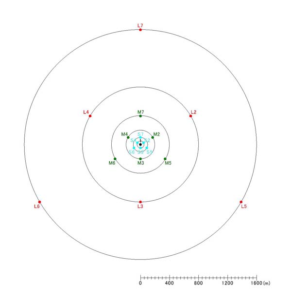 前年度調査ではアレー半径(200m, 600m, 2000m)の3重同心円形アレーを設計したが、本年度調査ではアレー半径(50m, 100m, 200m, 400m, 800m, 1600m)の6重同心円形アレーを設定した。これは、後節5.4.1(1)でも述べるように、空間自己相関法で選択可能なアレー半径の分布を、前年度調査よりも一様かつ広範囲にするための措置である。図5−2−2−1に、6重同心円形アレーの概念図を示す。すなわち、アレー中心上に1ヶ所、および6重同心アレー円周上に3ヶ所ずつ、計19ヶ所に地震計を円対称的に設置する。