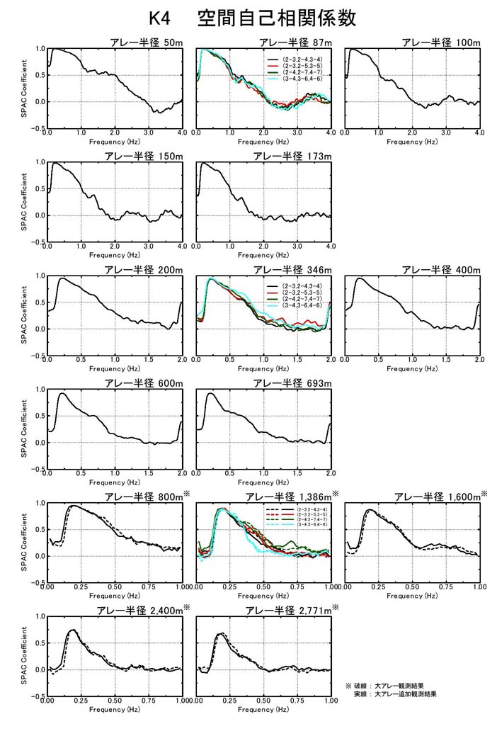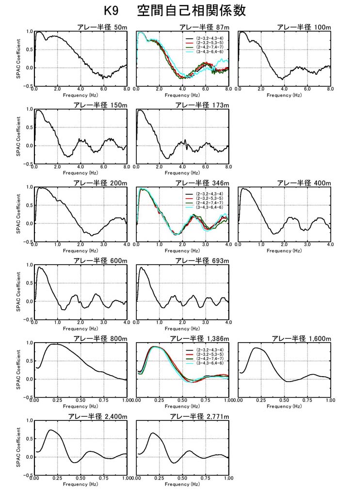 前節5.2.2に記したとおり、前年度調査の3重同心円形アレーに替えて、本年度調査では6重同心円形アレーを採用した。実際の観測では3種類の2重同心円形アレーの組み合わせを用いたので、解析時に利用可能なアレー半径は、各アレー地点毎に計15種類である。図5−3−3−1に、解析時のアレー半径の採りかたの模式図を示す。また、図5−3−3−2、図5−3−3−3、図5−3−3−4、図5−3−3−5、図5−3−3−6、図5−3−3−7、図5−3−3−8には、各アレー毎に求めた空間自己相関係数を示す。