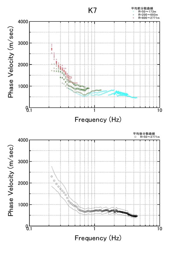 以上の考察から、アレー地点K4の場合、たとえば大アレー・中アレー両者の中間のアレー半径を有するような円形アレーを設定して追加微動観測を実施するなど、平均後の観測位相速度の確からしさを改善するべき余地があると考える。同様の議論は、K4以外のアレー地点全般についても当てはまる。